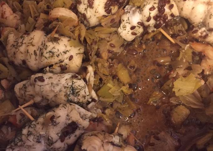 - Une fois les poireaux fondu ajouter le mes crevettes, le piment, les câpres laisser cuire 5 min (et ajouter soit du fumet de poisson soit du cognac soit du vin blanc)..